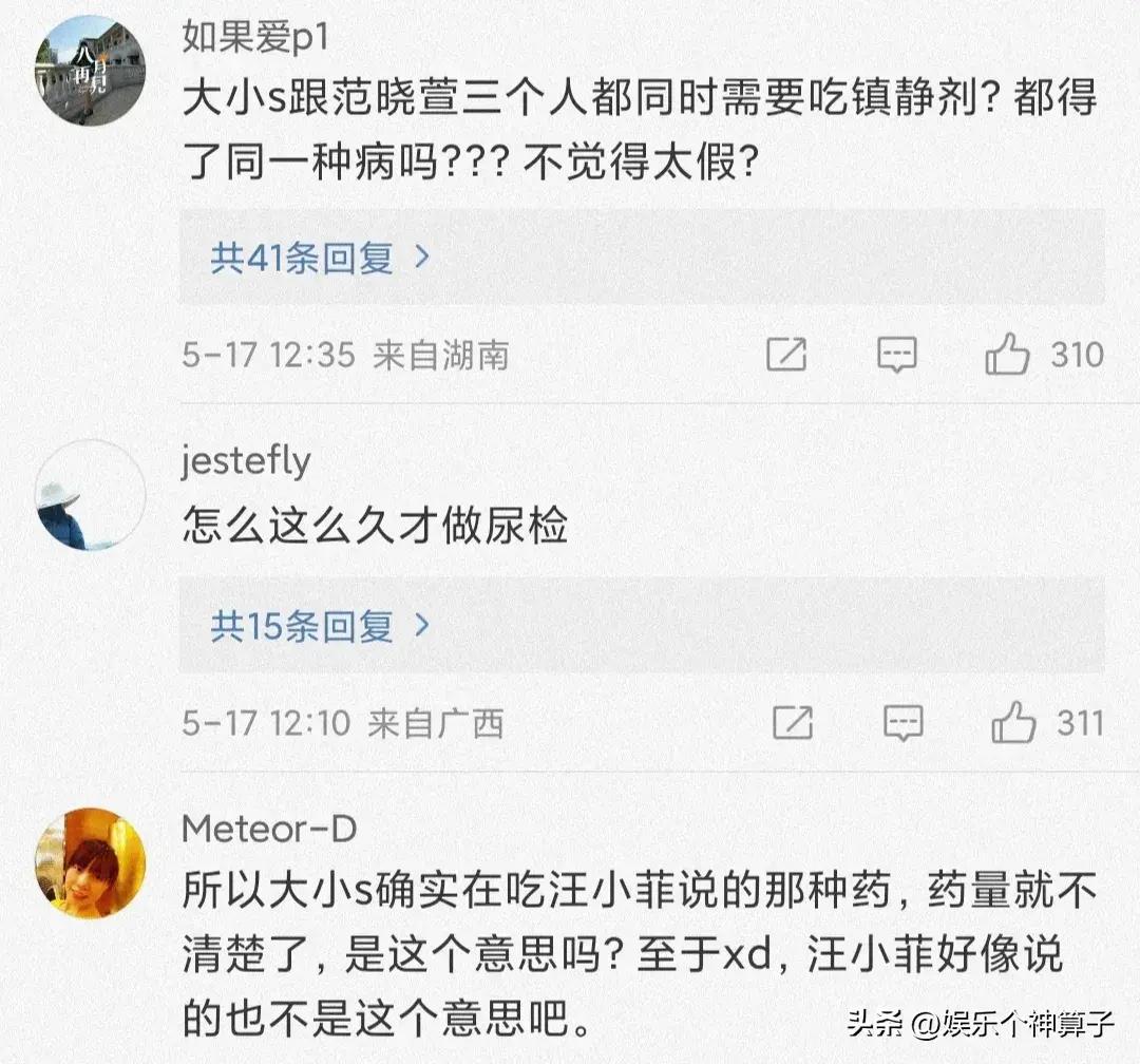 網友們也有一些疑惑,大S一直身體不太好,好友吳佩慈曾發文力挺大S,稱其只要累一點就癲癇發作,不可能吸毒,這麼看,偶爾服用藥物,可以理解,可小S又怎麼解釋?
