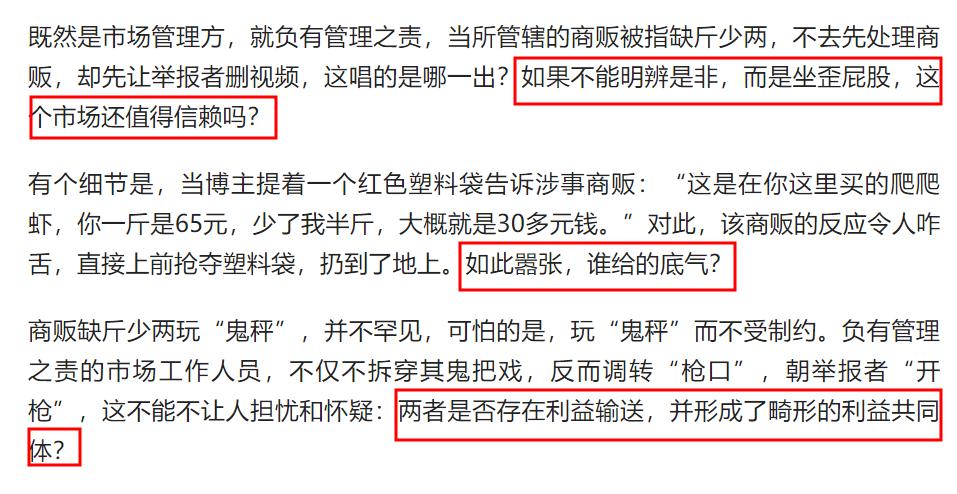 在發文的最後,人民網直言“消除‘鬼秤’亂象,應保護好舉報者。但是,光靠幾個舉報者之力,是不可能完全盪滌如此亂象的。說到底,市場管理方也應擔起責任,市場監管部門也要盡職盡責。如果任憑不良商販和失職市場管理方沆瀣一氣,消費者受傷害,法律也會蒙羞,而當地的營商環境和公共形象也會受到影響。”