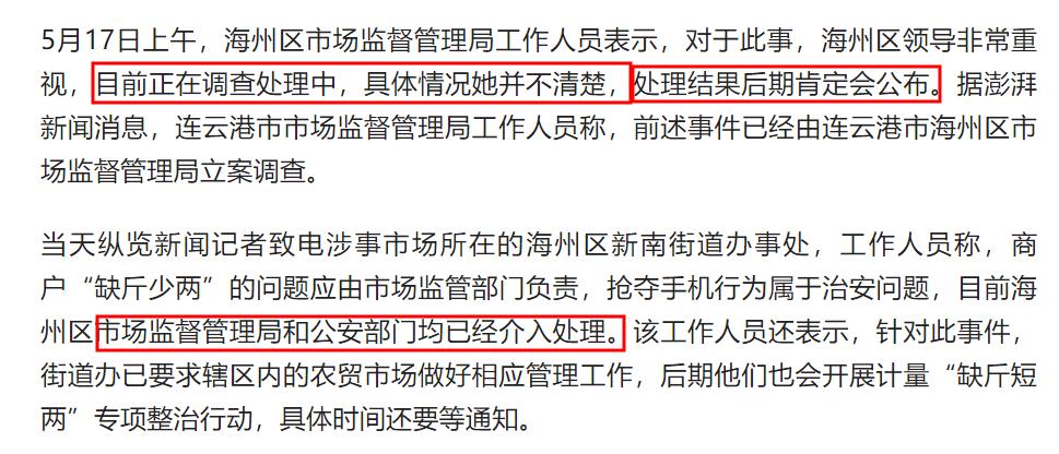 隨後,媒體又採訪了海州區市場監督管理局,該局工作人員回應稱此事正在調查處理中,處理結果肯定會公佈。