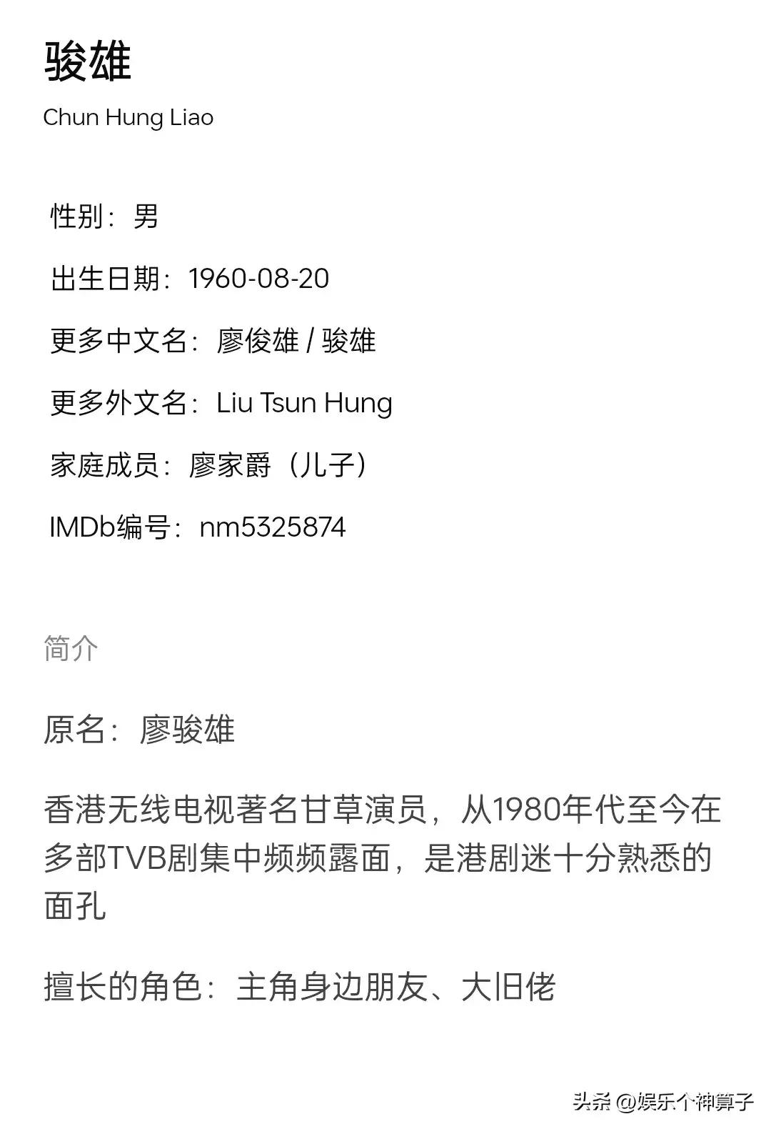 關於廖駿雄的個人資料,網上介紹也非常簡單,家庭成員一欄,只標註了兒子一人,不過,廖駿雄在娛樂圈的人緣特別好,跟周潤發、湯鎮業等都是特別好的朋友,經常一起爬山和健身,可見生活中性格非常開朗。