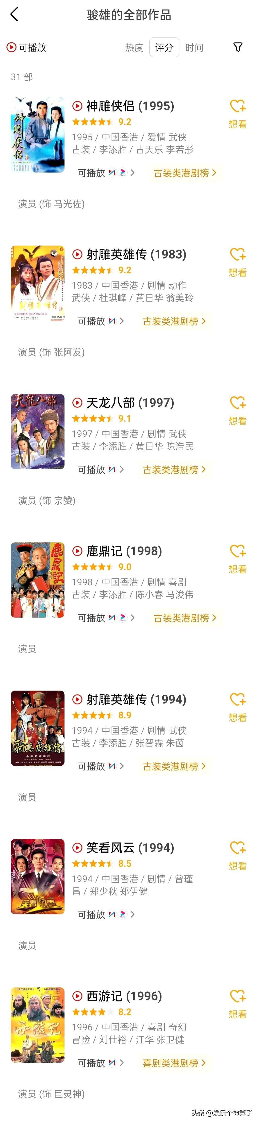 特意到網上科普一下,沒想到,廖駿雄曾出演過這麼多大家耳熟能詳的作品,包括《鹿鼎記》和《神鵰俠侶》,可能並不是重要角色,所以相對於同期的無線演員,人氣並不算高。