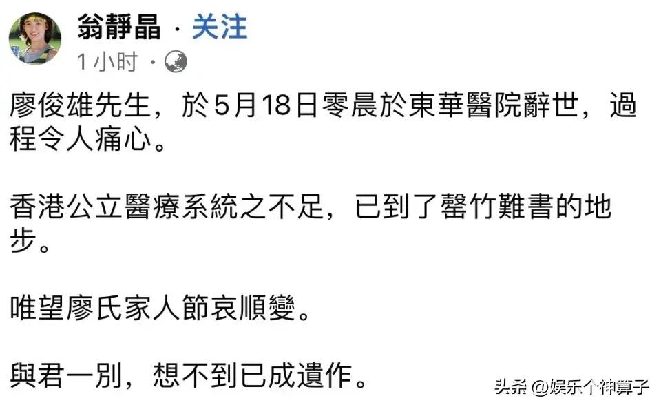 隨後,藝人翁靜晶在社交平臺發文,確認廖駿雄去世的消息,並透露好友于18日凌晨在東華醫院辭世,過程令人痛心。