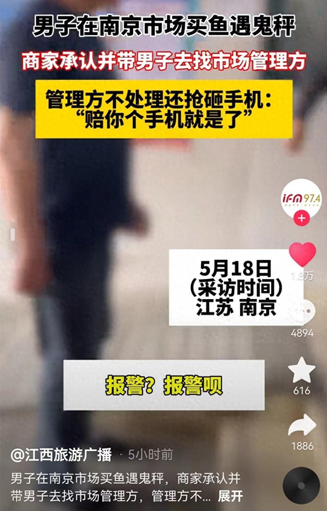 5月18日上午8點多,打假博主黑白一二在短視頻平臺發佈了一條他在南京遭遇鬼秤的視頻。
