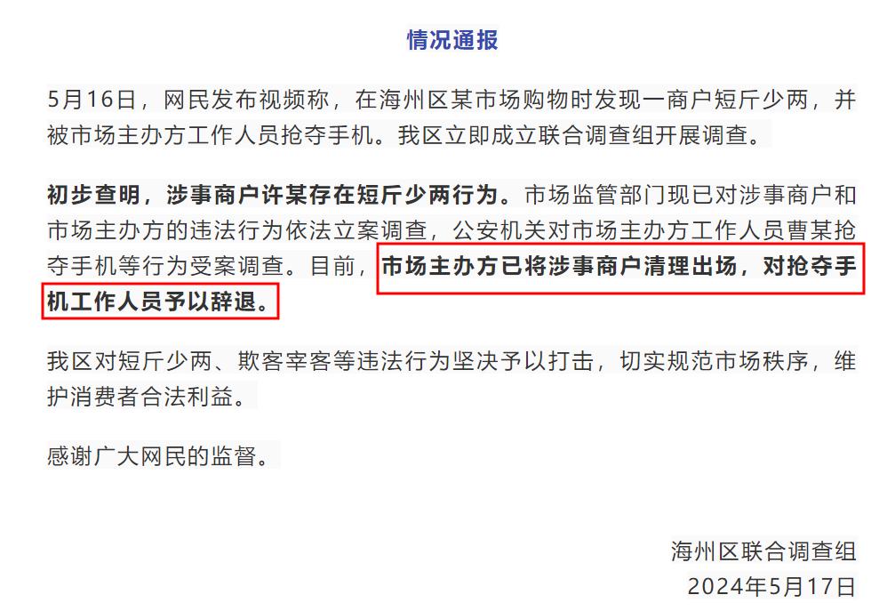 從視頻中可以看到,黑白一二見賣魚商戶承認了自己的問題,便讓他帶着秤一起去見市場管理方,讓市場管理方來處理這件事情。