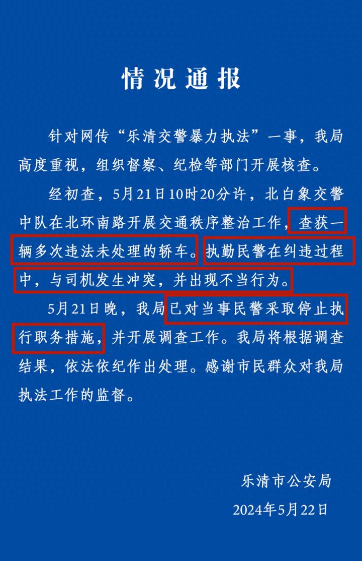 到了5月22日下午2點多,樂清公安就針對此事發布了情況通報。