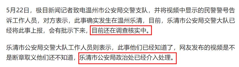 有媒體聯繫了樂清市公安局交警大隊。該交警大隊工作人員回應媒體稱此事已經上報,樂清市公安局政治處已經介入,“會有批示下來,目前還在調查覈實中。”
