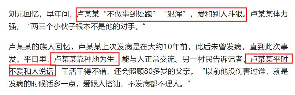 而在事發之前,盧某某一直喫藥控制,能和他人正常交流。在村民的印象裏,他患病之後沒有明顯出現過打人、傷人的傾向,只是變得不愛和人說話。