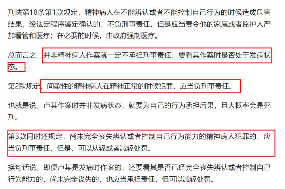 如果盧某某是在精神正常的時候製造如此慘案,他毫無疑問將被判死刑。