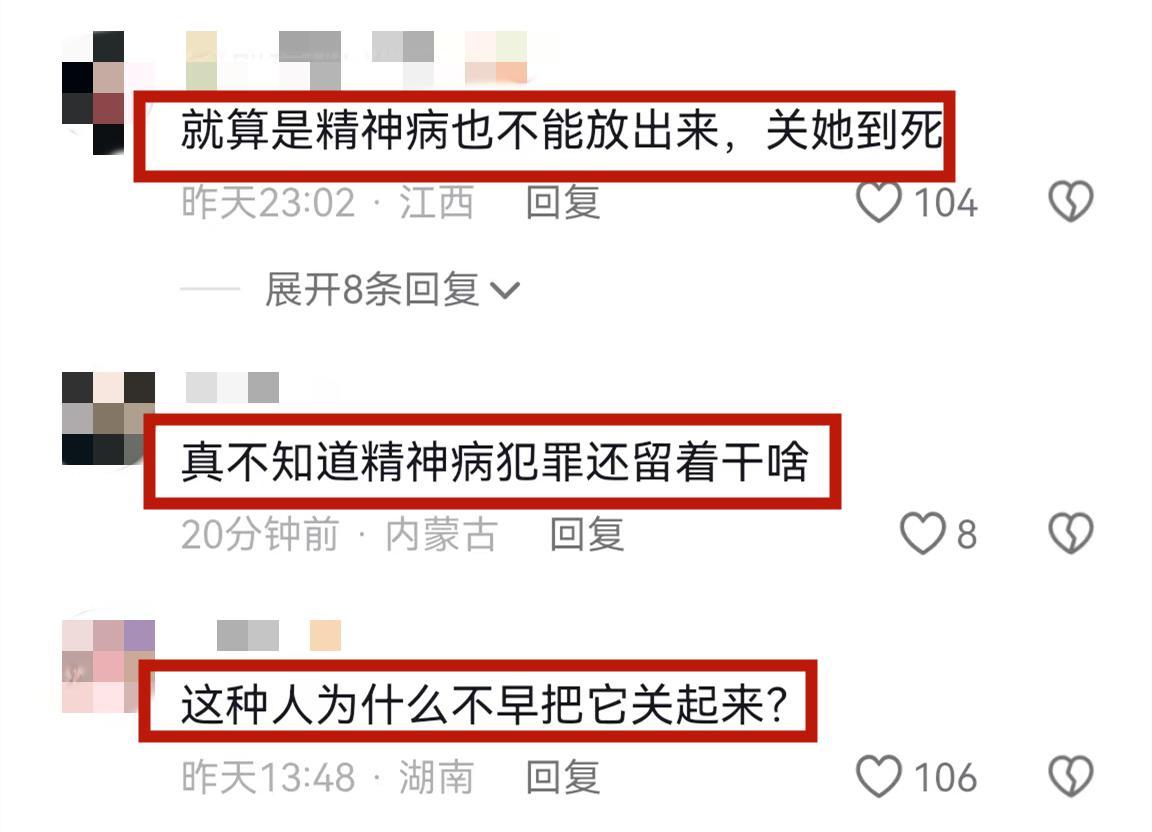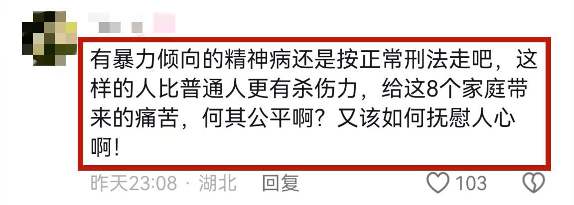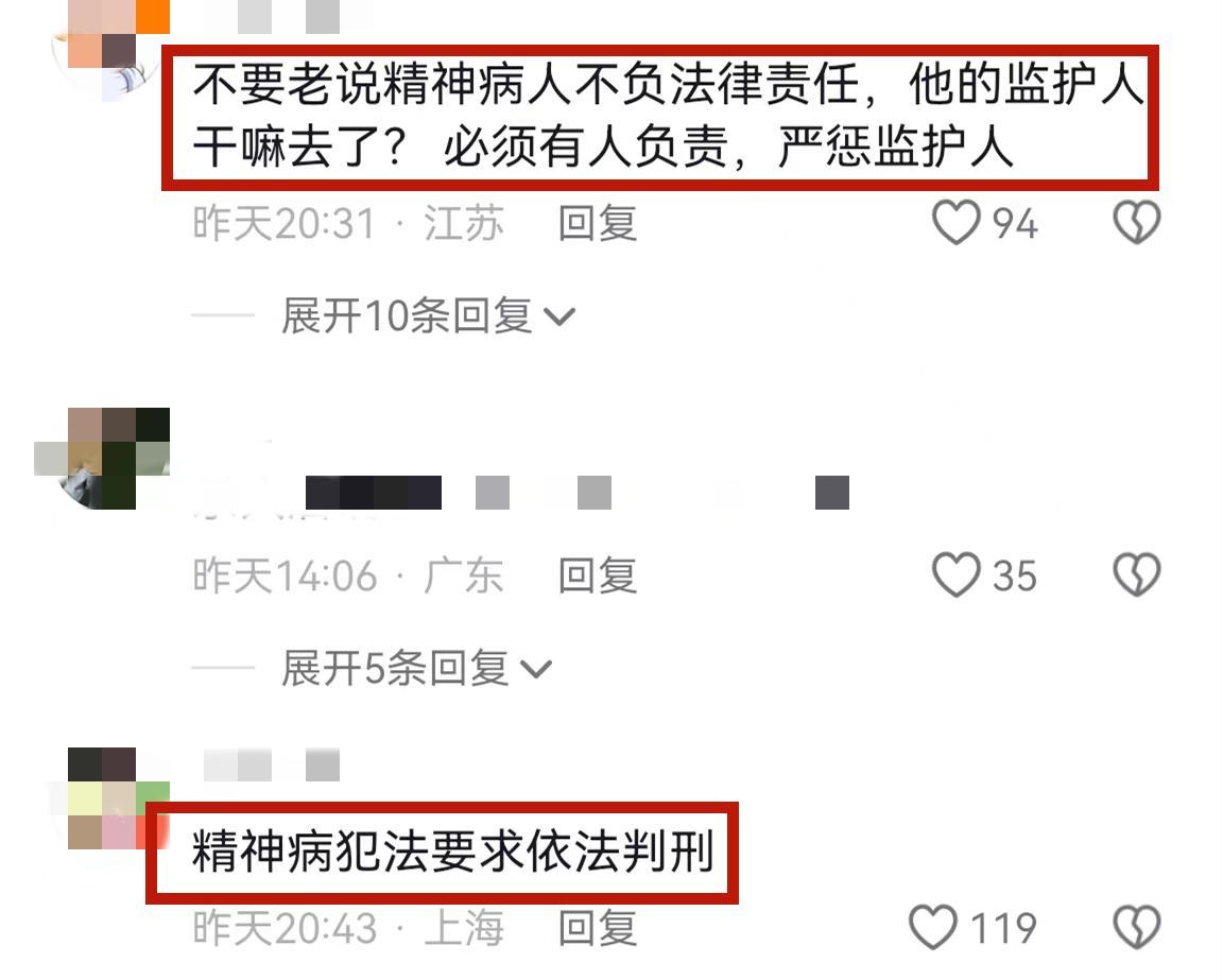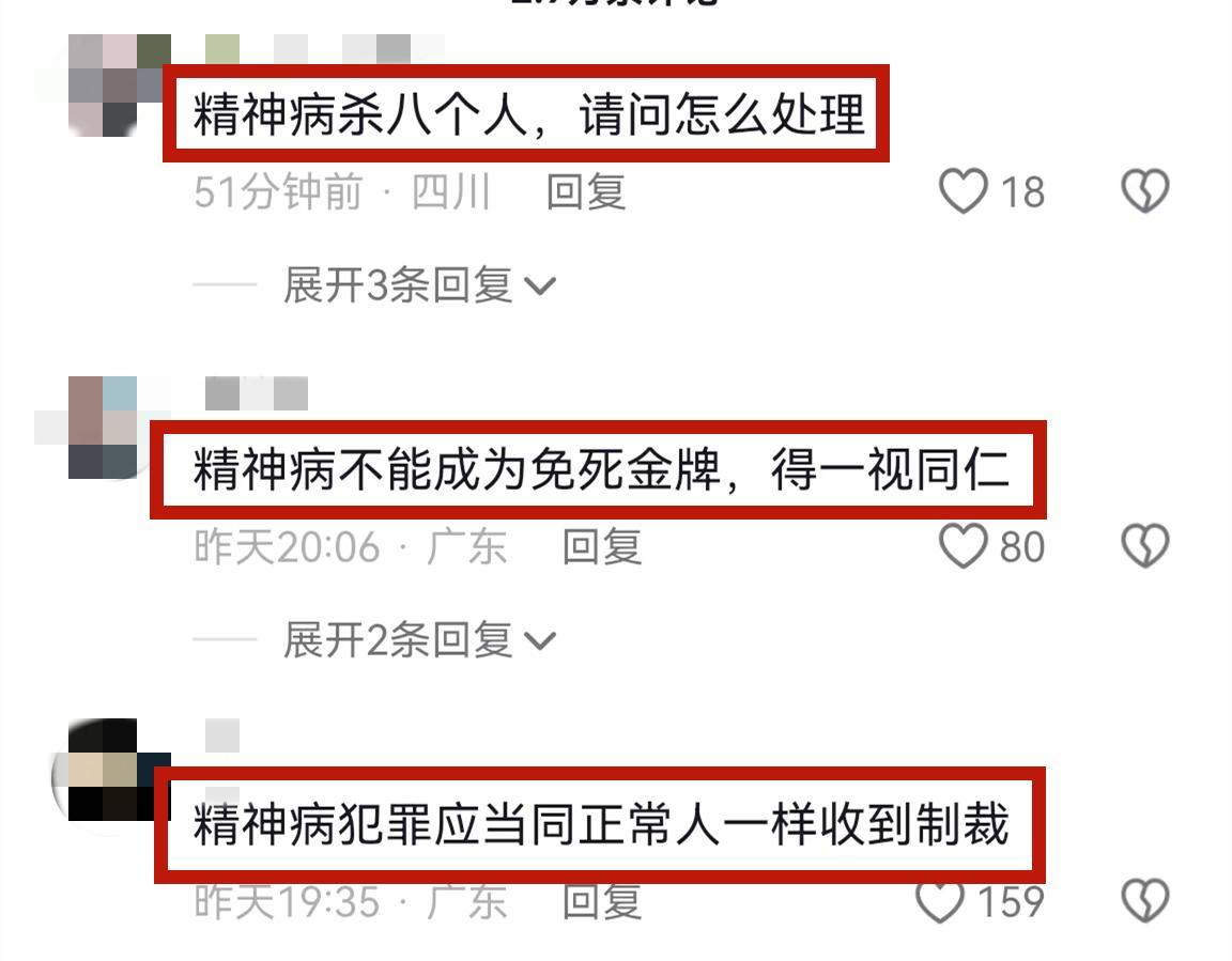 於是在媒體報道的評論區,衆多網友紛紛留言“精神病不能成爲免死金牌,得一視同仁”“精神病犯法要求依法判刑。”