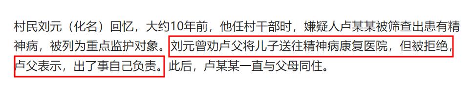 而盧某某被查出患有精神病則是在10年前,當時劉元還在擔任村幹部,他建議盧某某的父親將盧某某送往精神病康復醫院,但盧某某的父親拒絕了劉元的提議。