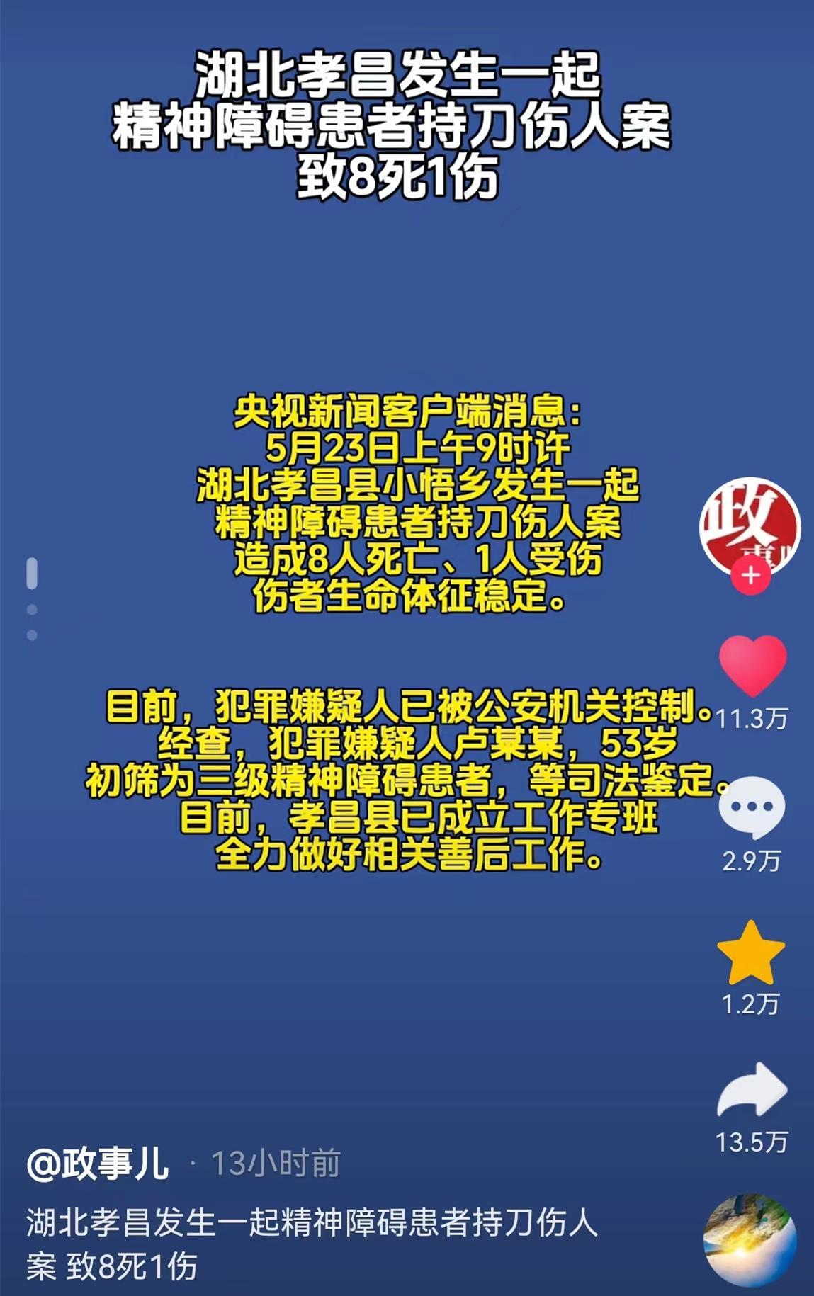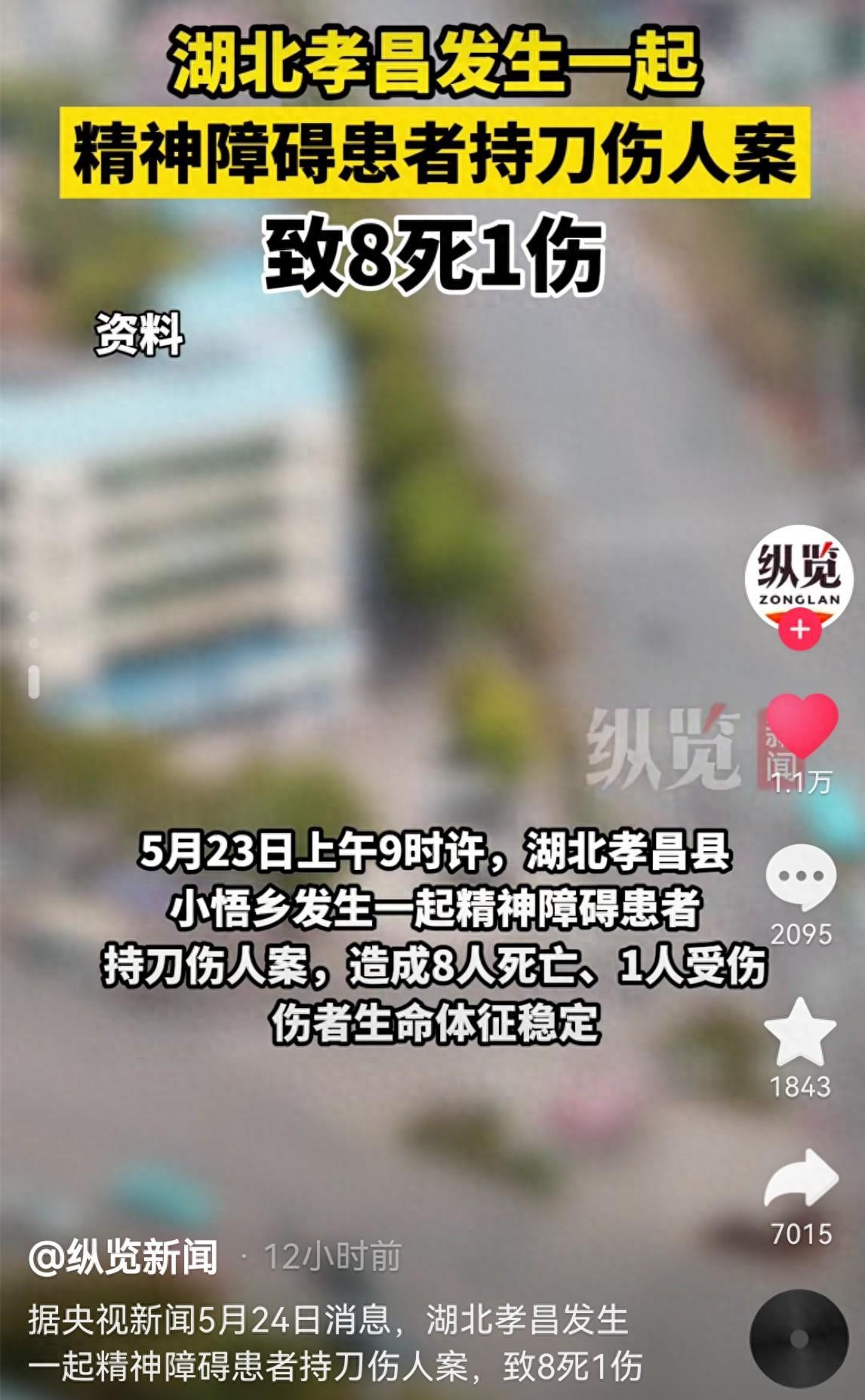 根據央視新聞的報道可知,5月23日上午9時許,孝昌縣小悟鄉發生一起持刀傷人案,造成8人死亡,1人受傷。
