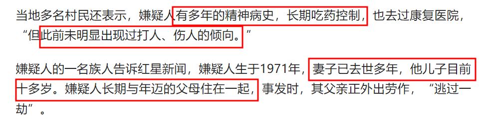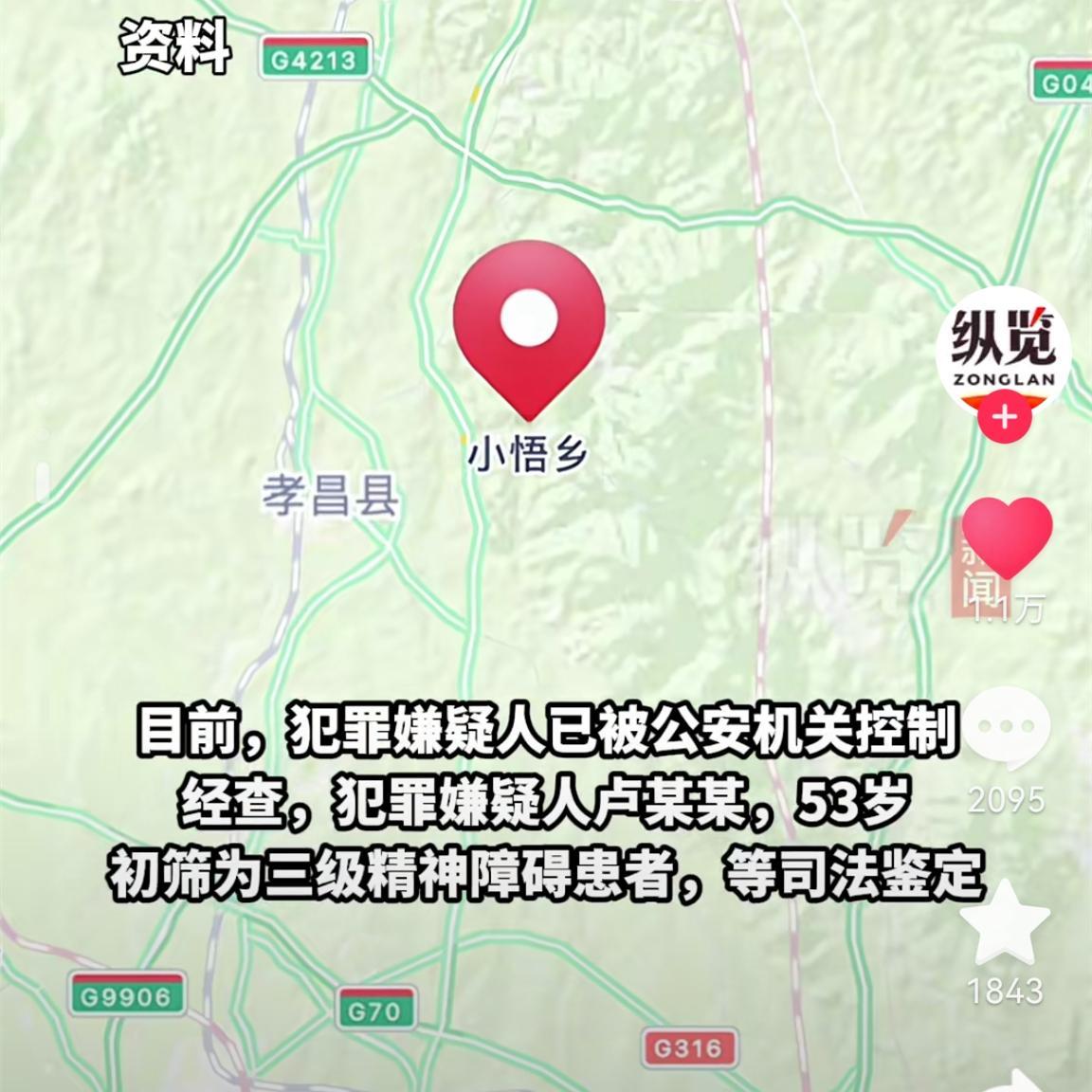 目前,犯罪嫌疑人已經被當地警方控制。經查,犯罪嫌疑人盧某某,今年53歲,初篩爲三級精神障礙患者,現在警方在等司法鑑定。