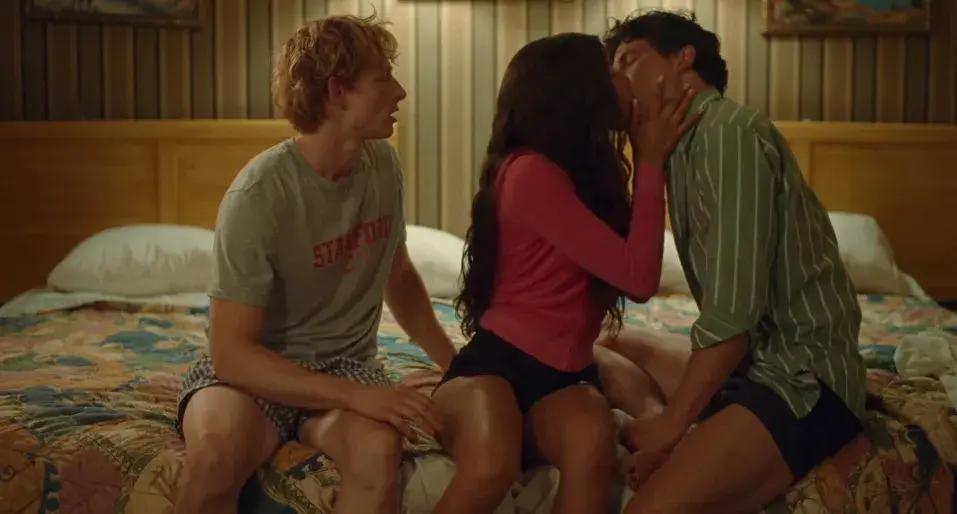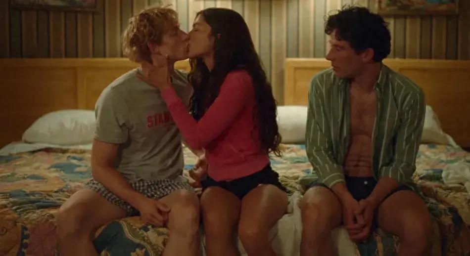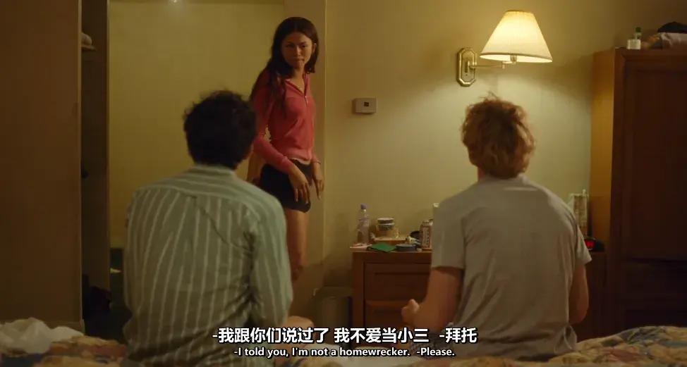 兩男一女坐在破舊小公寓的牀上,兩邊的男人用無比渴望的癡漢眼神,直勾勾地盯着中間的女孩。