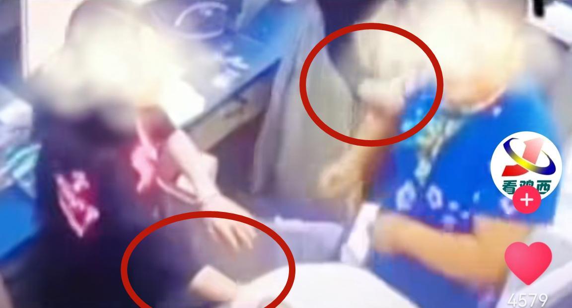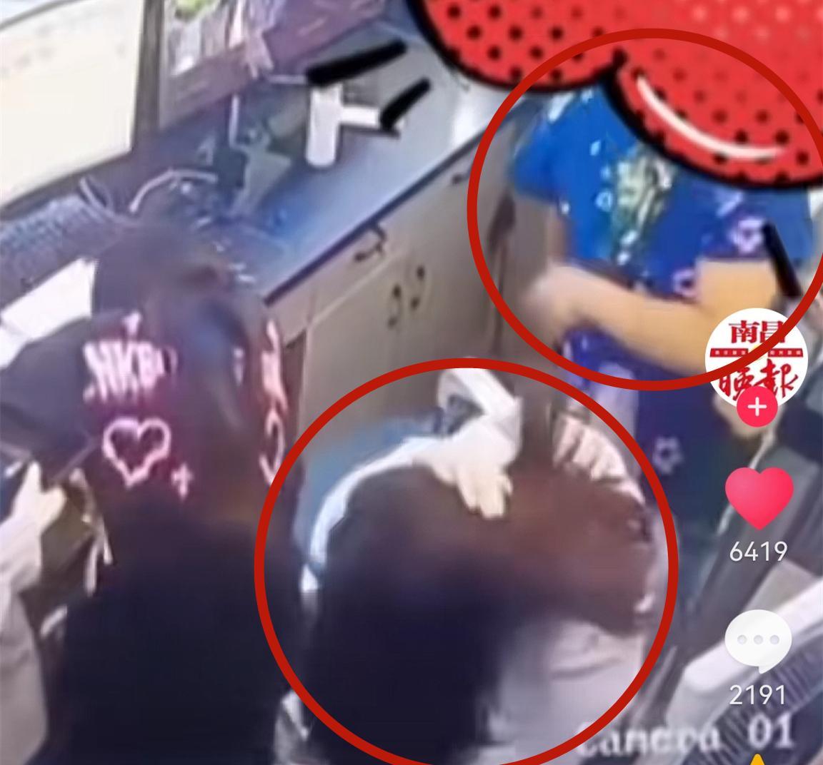 在這個過程中,在前臺的另2名女士想上前阻攔男子施暴,但又不敢完全攔住男子,只能伸出一隻胳膊稍微阻攔一下。反而是男子身後的一名女子拉扯着男子的胳膊,將他往外拉。