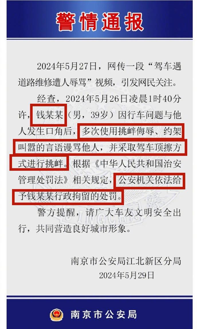 根據通報可知,事發於2024年5月26日凌晨1時40分左右,彼時39歲的錢某某因爲行車問題與他人發生口角後,多次使用挑釁侮辱,約架叫囂的言語謾罵他人,並採取駕車頂擦方式進行挑釁。