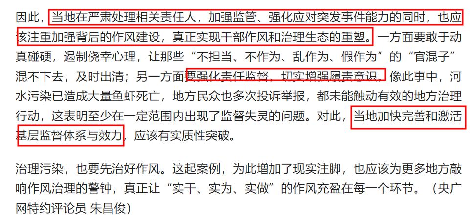 如今此事已經在輿論場上告一段落,筆者和萬千網友一樣,希望被污染的水質早日恢復如初,希望領導幹部們“在其位謀其政”,讓“實幹、實爲、實做”的作風充盈在每一個環節。