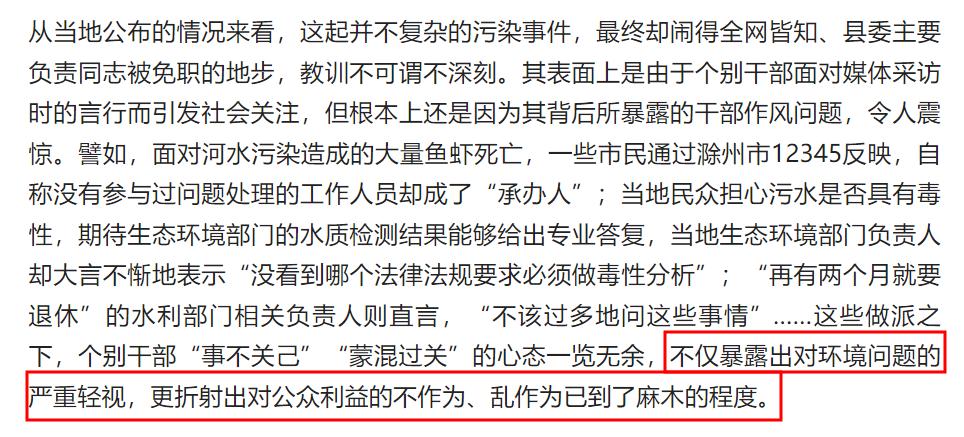 央廣網還提到涉事幹部的做派,“不僅暴露出對環境問題的嚴重輕視,更折射出對公衆利益的不作爲、亂作爲已到了麻木的程度。”