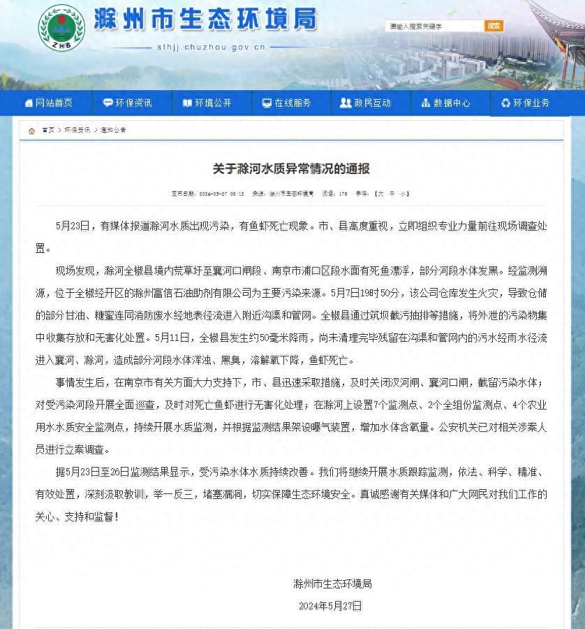 而在此次報道中,央視新聞也找到了滁州河水被污染的原因,原來是在5月7日,滁州富信石油助劑有限公司倉庫裏的危化品着火了,導致污染物外泄流入滁河,導致滁河水質出現問題。