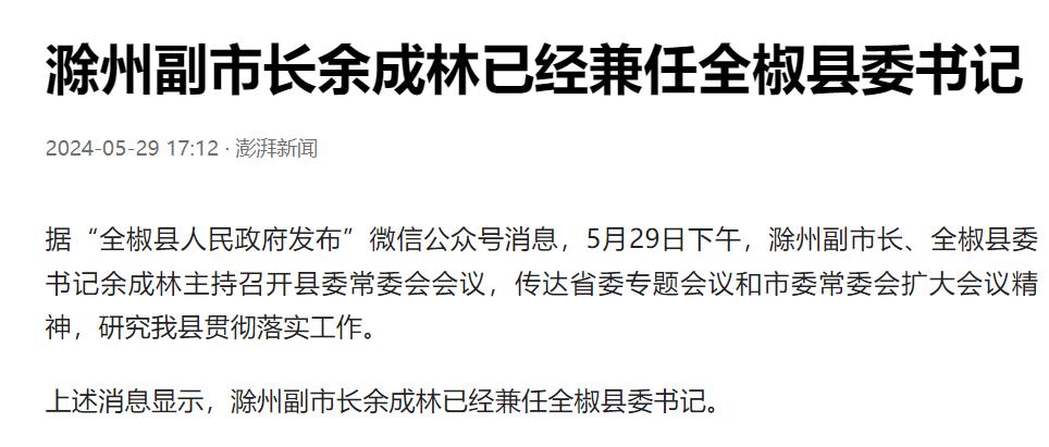 後續一:全椒縣縣委S記楊光被免職,滁州市副市長餘成林擔任新一任全椒縣縣委S記。