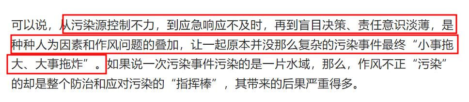 央媒央廣網針對此事進行了銳評,央廣網一句便道出此事引爆輿論的原因“從污染源控制不力,到應急響應不及時,再到盲目決策、責任意識淡薄,是種種人爲因素和作風問題的疊加,讓一起原本並沒那麼複雜的污染事件最終‘小事拖大、大事拖炸’”。