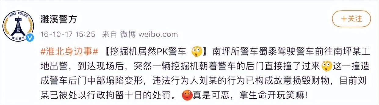 我查了一下,16年,安徽省淮北市濉溪縣公安局官方微博曾發佈過一條【挖掘機居然PK警車】的微博。