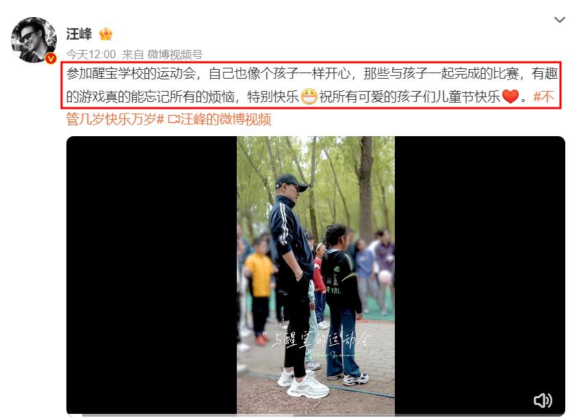 6月1日中午12點,汪峯在社交賬號上更新了一條動態,他寫道:參加醒寶學校的運動會,自己也像個孩子一樣開心,那些與孩子一起完成的比賽,有趣的遊戲真的能忘記所有的煩惱,特別快樂!祝所有可愛的孩子們兒童節快樂!