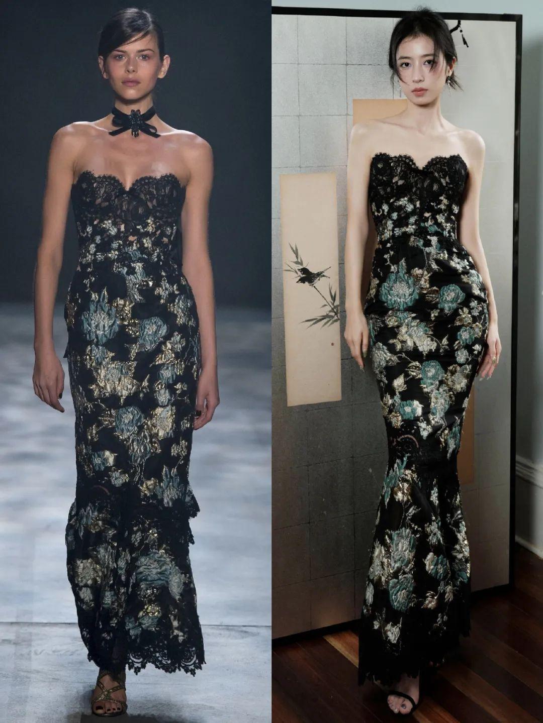 這件黑絲絨交叉掛脖連衣裙,原本模特身上深V是一大亮點,張天愛給縫了起來。