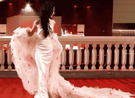 也不知道爲什麼大片裏明明還可以的新中式旗袍,到紅毯上給換下了。