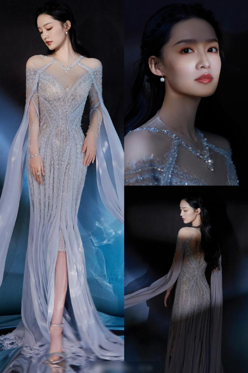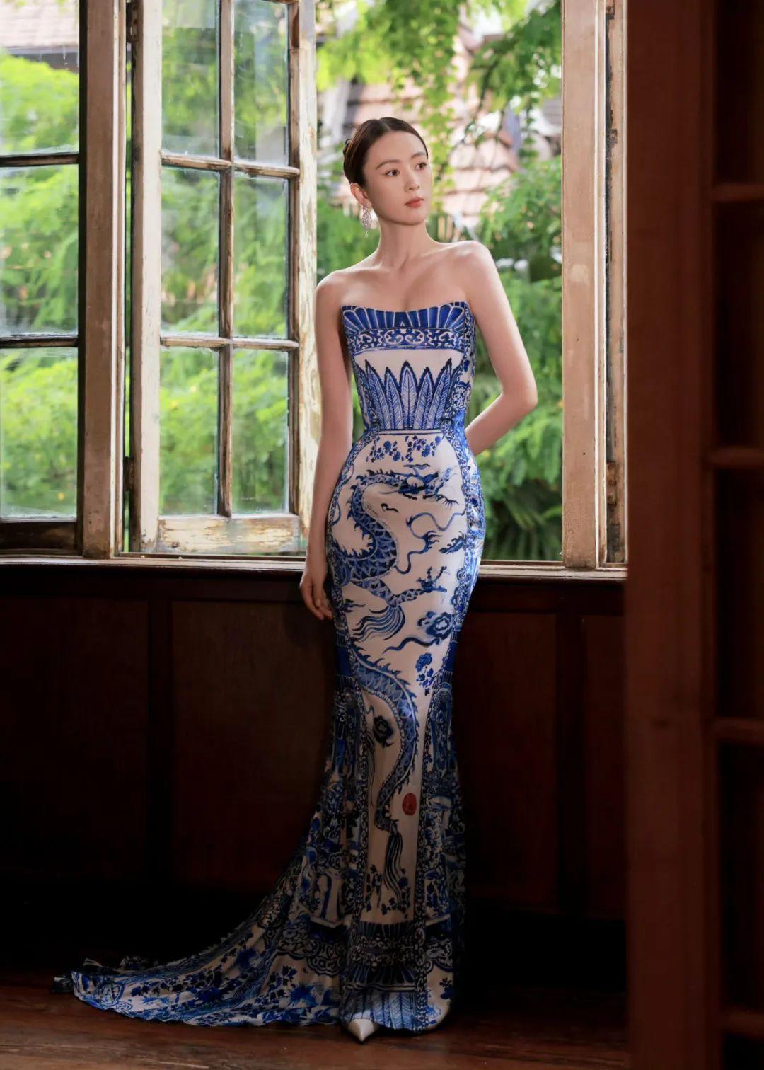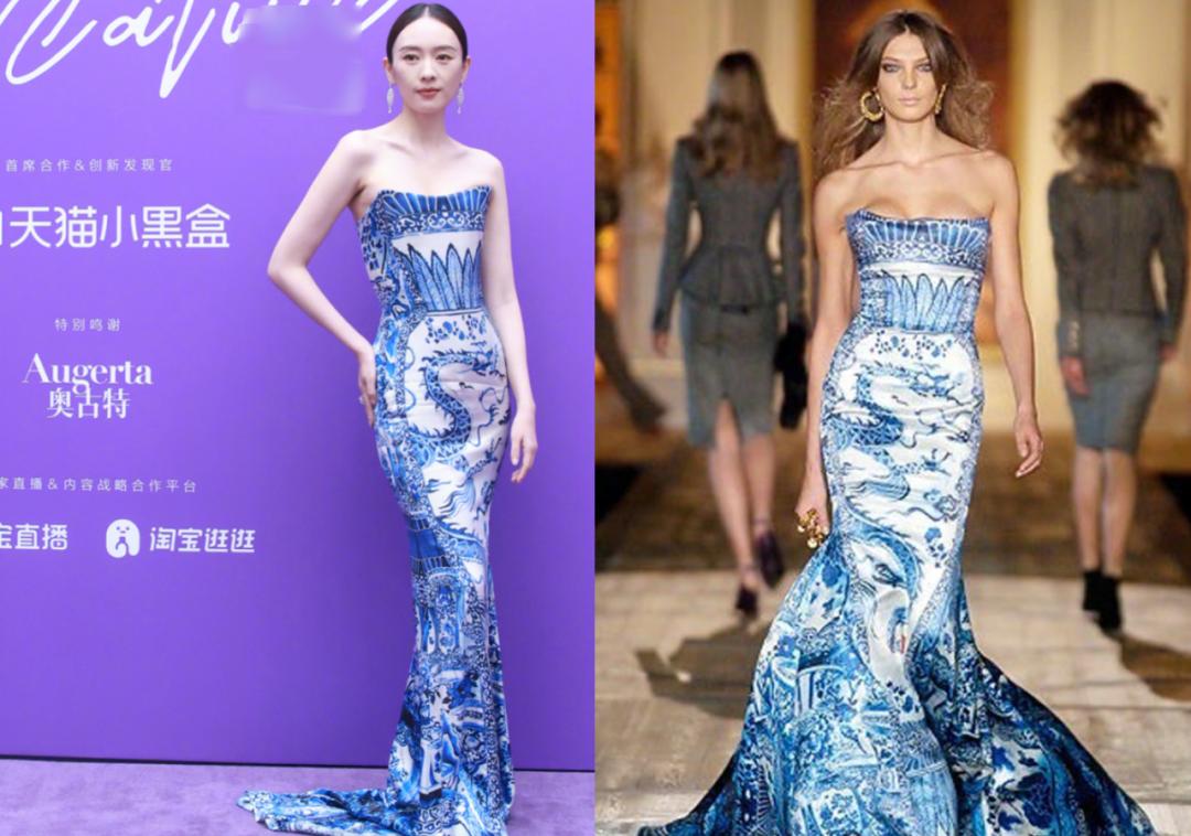 典雅江南味的童瑤也讓人眼前一亮,青花瓷魚尾長裙來自Roberto Cavalli。