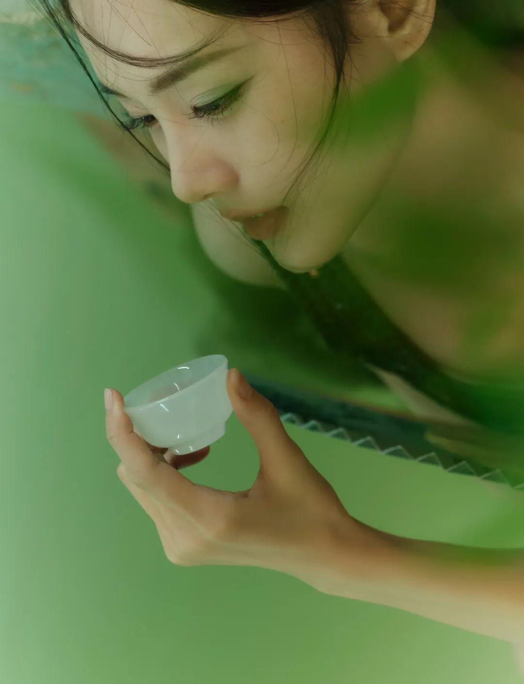 青翠竹林,李一桐或倚靠在石上,或手捧玉盞,亦嬌亦媚,不禁讓人想到張曼玉演繹的小青。