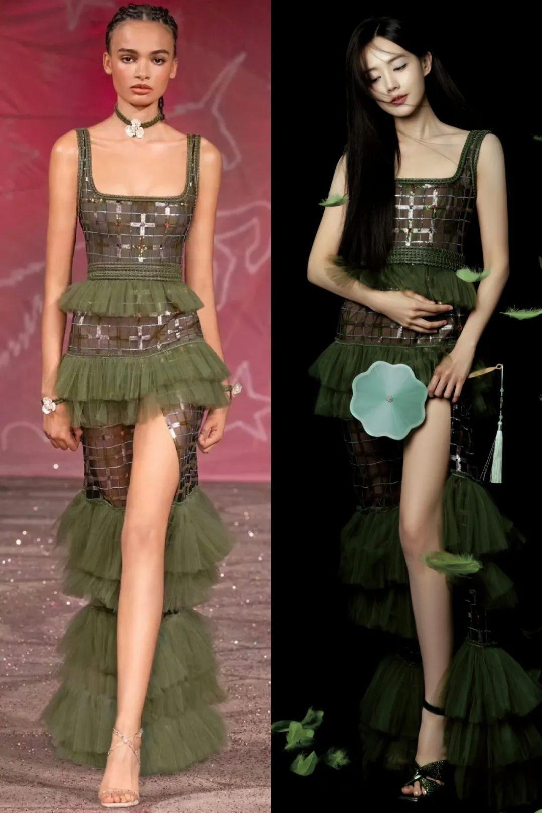 對比秀場模特,多加的內襯也讓裙子原本的仙氣輕盈變得蕩然無存。