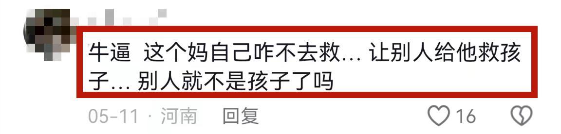 有網友說作爲母親,應該第一時間自己去救孩子,而不是讓別人去救。