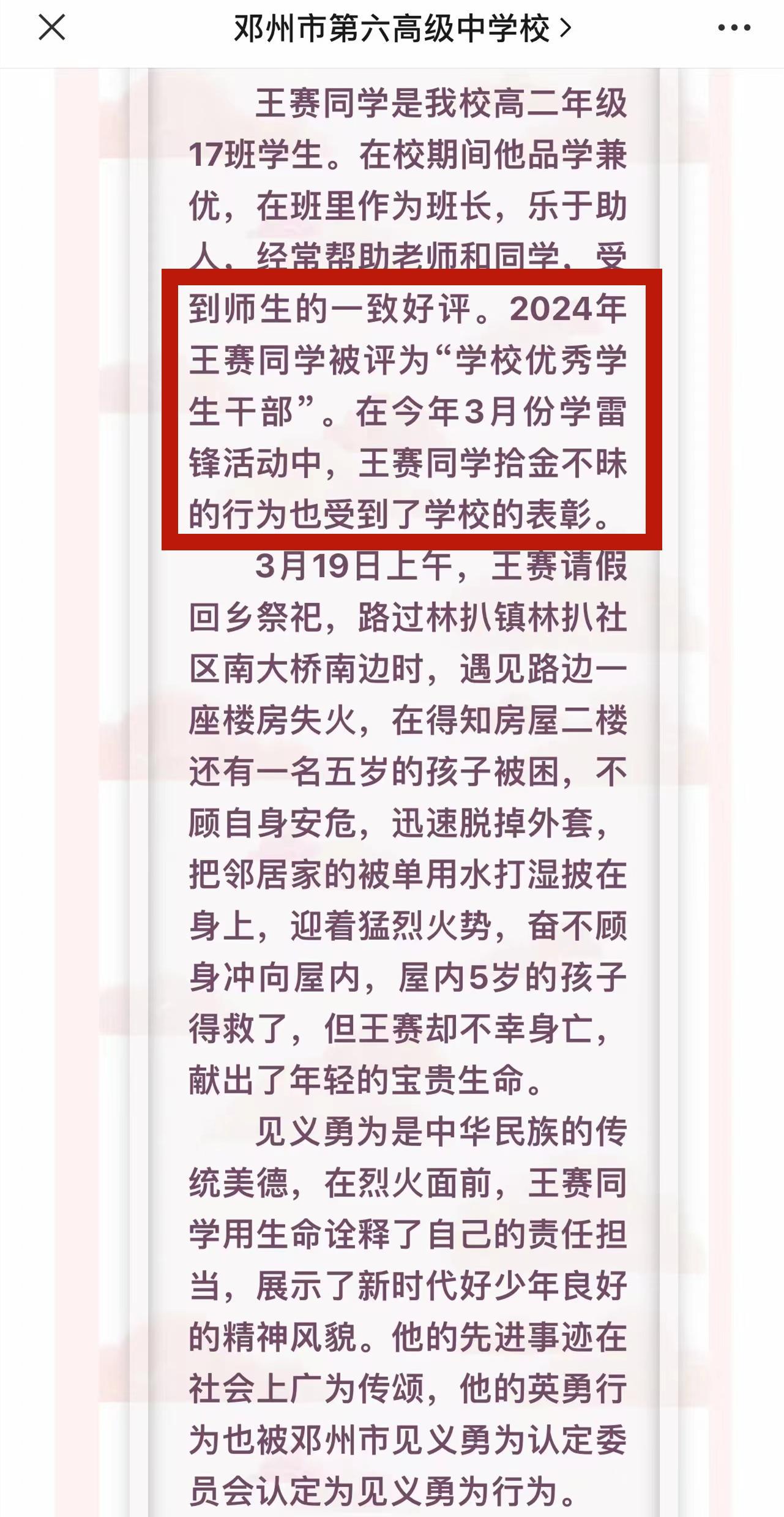 近日,媒體報道了河南南陽鄧州17歲少年王賽的英雄故事。