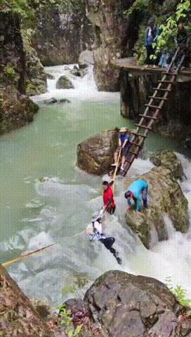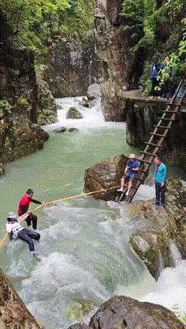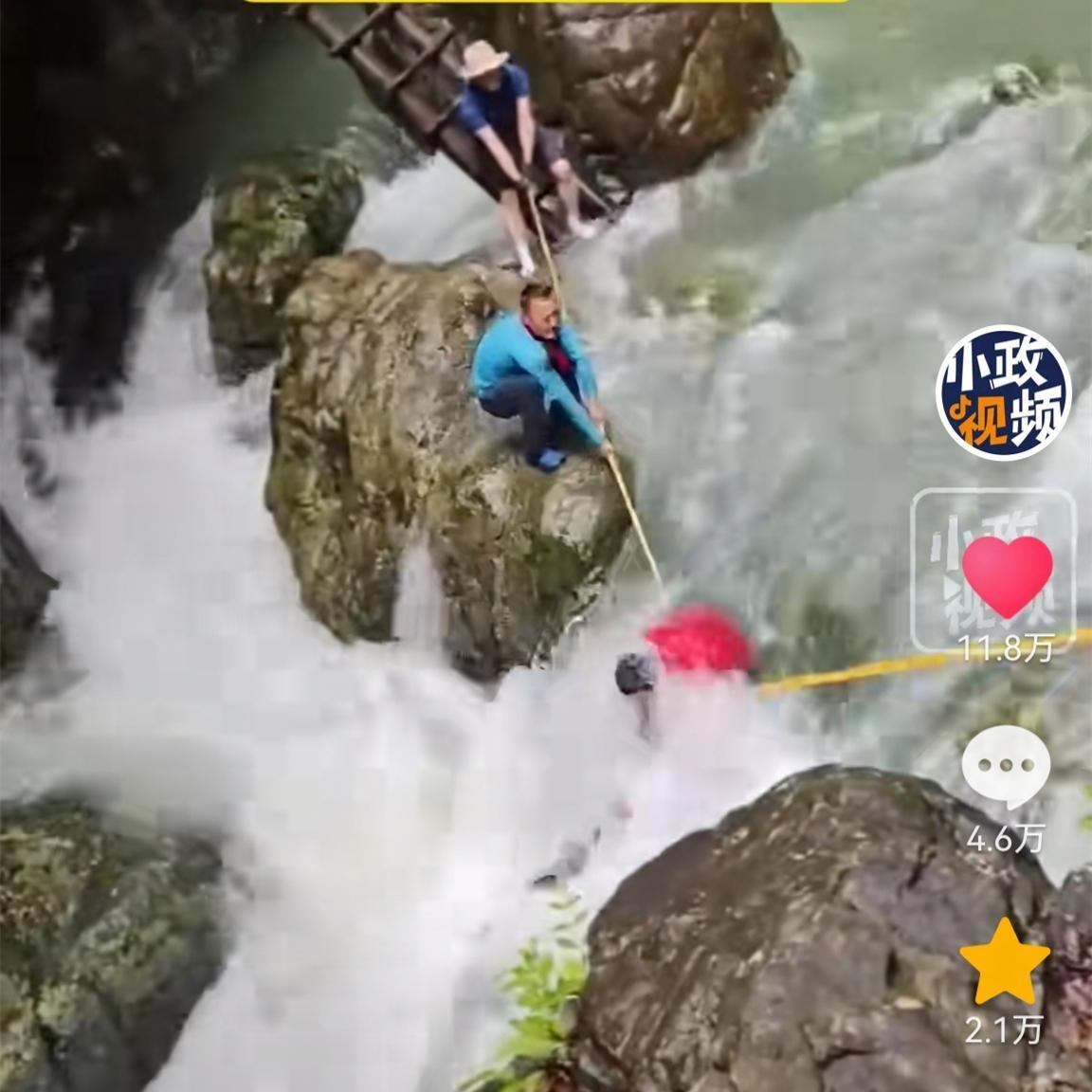 從網傳的3分多鐘現場視頻中可以看到,一羣驢友要橫渡石人峽的某個溪流,他們借用一條繩索橫渡。