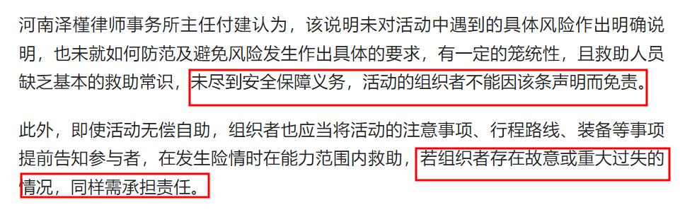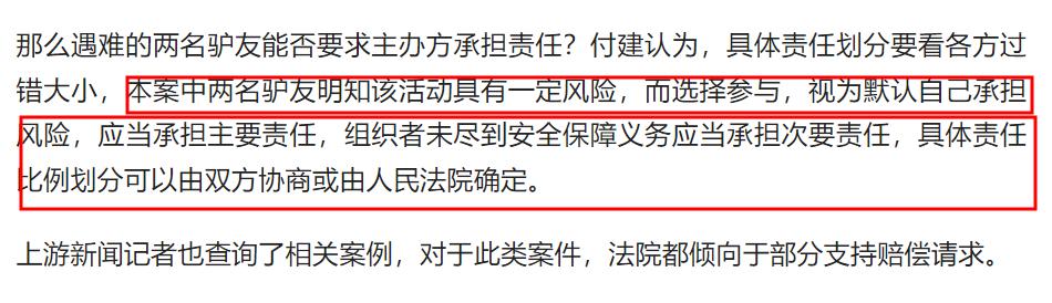 律師稱此次事故,2名遇難驢友承擔主要責任,但主辦方沒有盡到安全保障義務應當承擔次要責任,具體責任比例劃分可以由雙方協商或由人民法院確定。