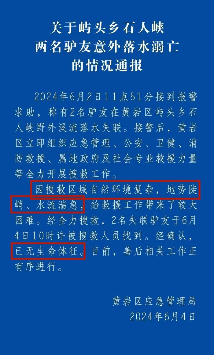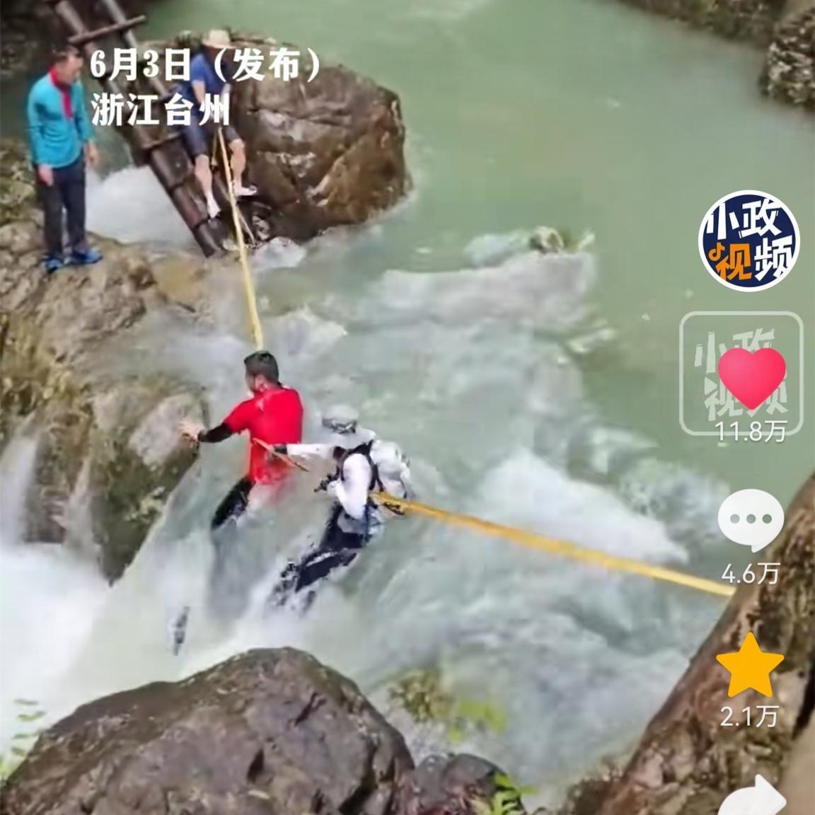 6月4日,針對2名驢友在浙江台州石人峽被大水沖走失聯的事情,台州當地應急管理局發佈了情況通報。