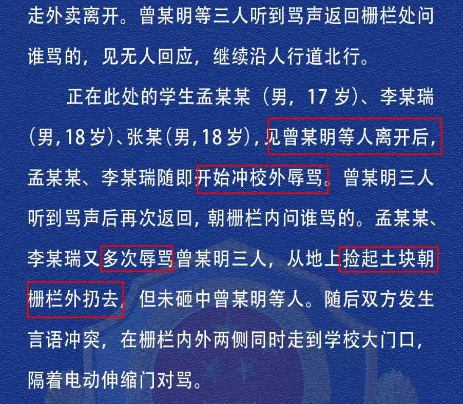 孟某某和李某瑞的行爲徹底惹惱了曾某明等人,他們開始發生口角,他們隔着學校的電動伸縮門對罵。