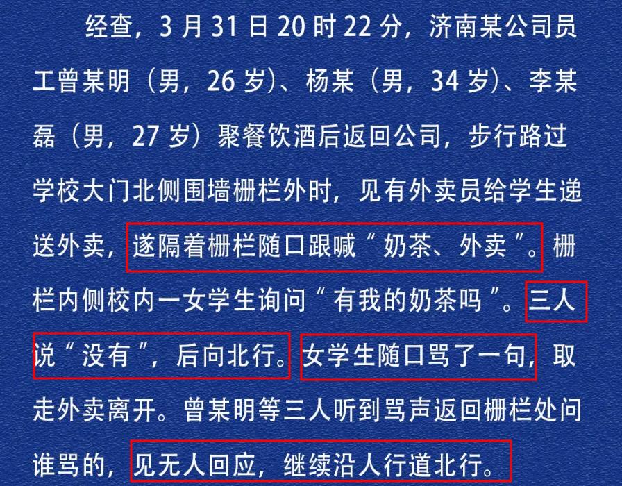 根據通報可知,事發當天曾某明,楊某,李某磊在聚餐飲酒結束後路過涉事學校,看到有外賣員給學生遞外賣,便隔着圍欄跟着喊“奶茶,外賣。”