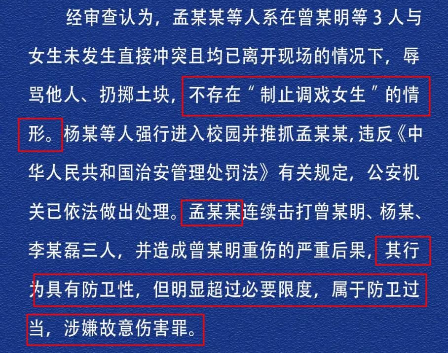 結論二:楊某等人強行進入校園並推抓孟某某,已按相關法律法規,依法作出處理。