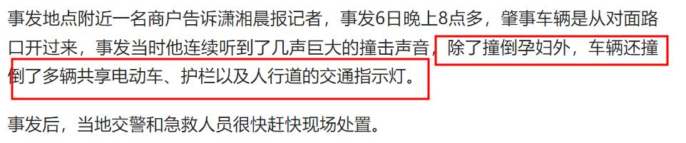 一位事發地附近的商鋪老闆說當時肇事車輛從路口偏左直衝到店鋪階梯,然後才停下。在這個過程中,肇事車輛撞倒了一名孕婦,還撞倒了多輛共享電動車以及護欄和人行道的交通指示燈。