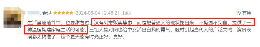 “沒有刻意販賣焦慮,而是把普通人的現狀擺出來,不狗血,提供了一種溫暖構建家庭生活的可能。”