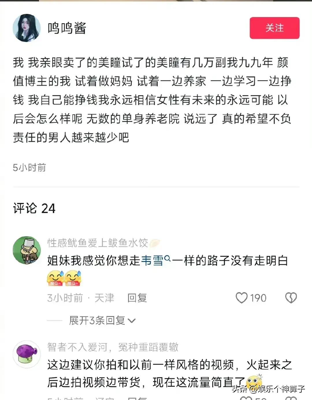 有網友留言,認爲既然當初自願生下小孩,沒必要責怪男方不負責任,黃一鳴透露,讓父親看寶寶的時候,被對方直接拉黑了,纔會借酒消愁,在網上進行吐槽。