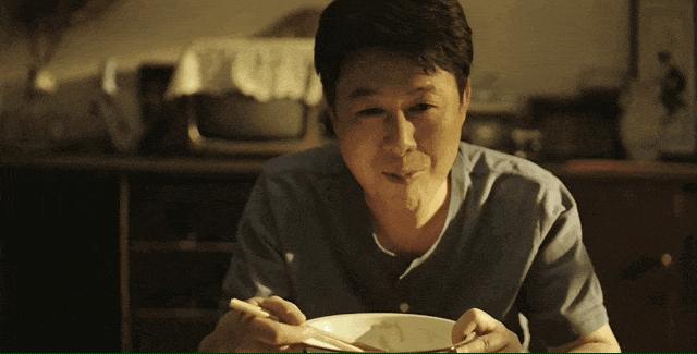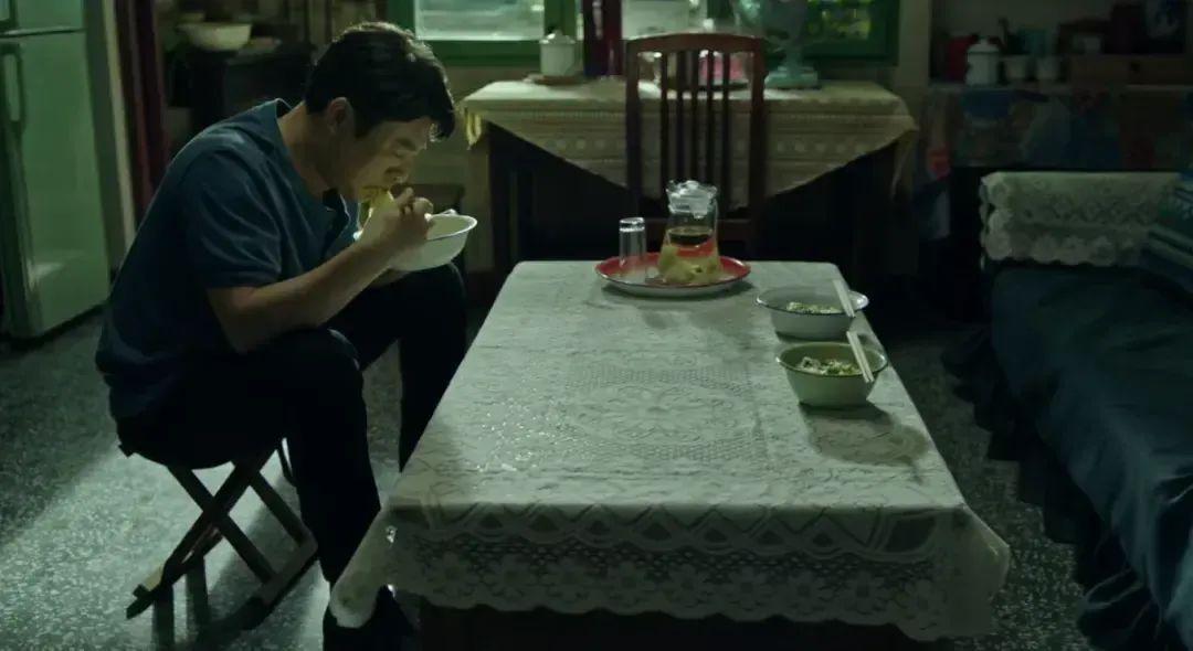 最後低頭喫麪時,他動作顫抖,悲傷地流下淚水。