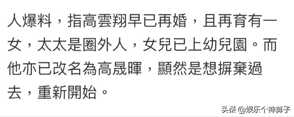 6月12日,據港媒爆料,知情人透露高雲翔已經低調再婚,並且已經改名爲高晟暉,意在忘掉過去,開啓新生活,現任妻子是圈外人,兩人婚後育有一個女兒,非常幸福。