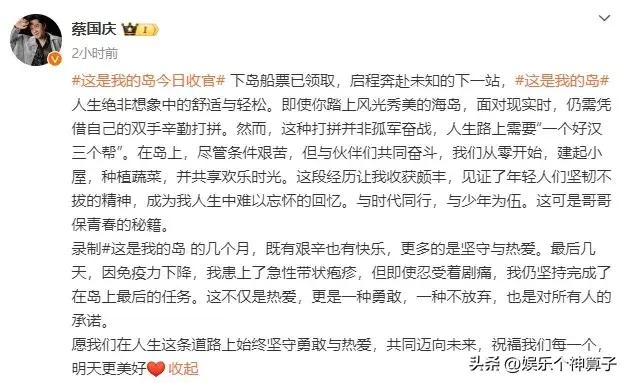 6月14日,蔡國慶在社交平臺發文,慶祝綜藝節目《這是我的島》完成錄製,並曬出一組與嘉賓的合影,記錄在艱苦條件下一起度過的歡樂時光。