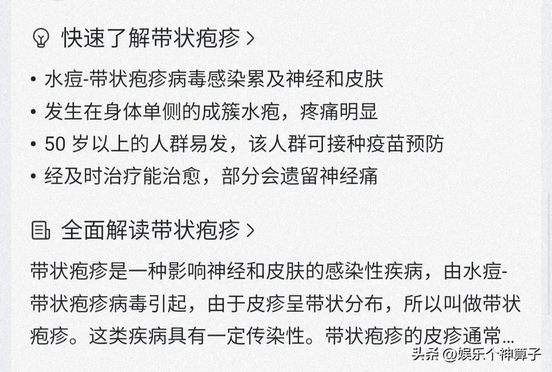 出於好奇,特意到網上科普一下關於帶狀皰疹的知識(僅供參考),一種皮膚感染性疾病,症狀疼痛難忍,估計只有患病者纔有切身感受吧!