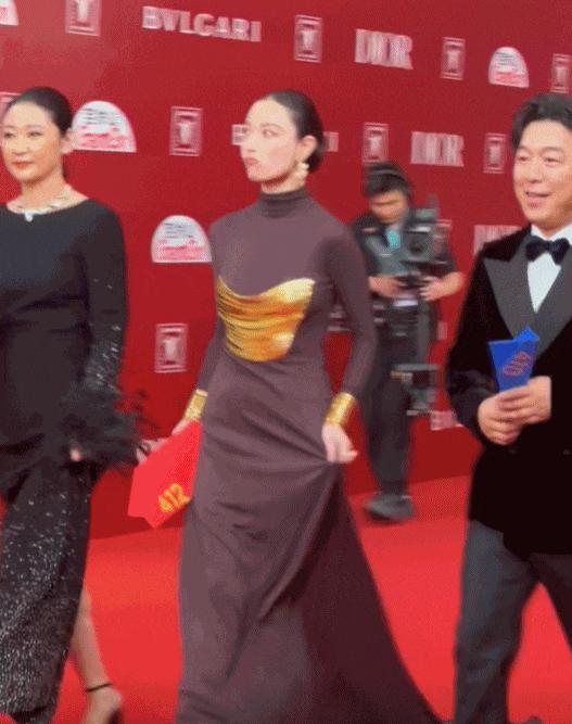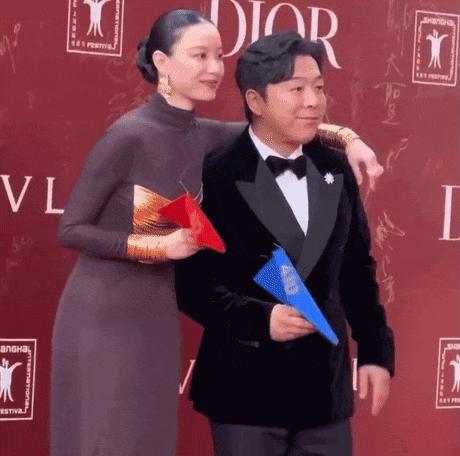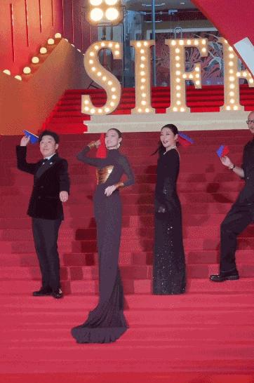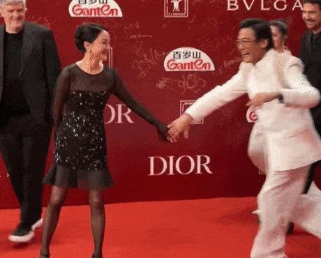 走上紅毯的周迅還穿了黑絲,性感嫵媚,和小跑着微笑打招呼的梁家輝形成鮮明對比,一個i人一個e人。