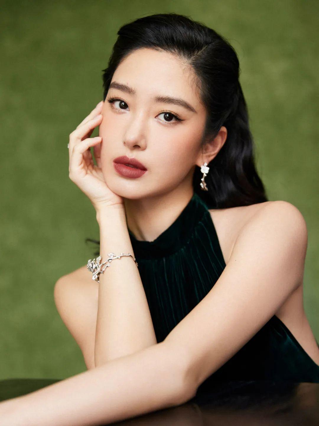 在工作室寫真裏,身穿墨綠色絲絨裙、梳着復古捲髮的她與綠色背景相互映襯,盡顯風情與婀娜。