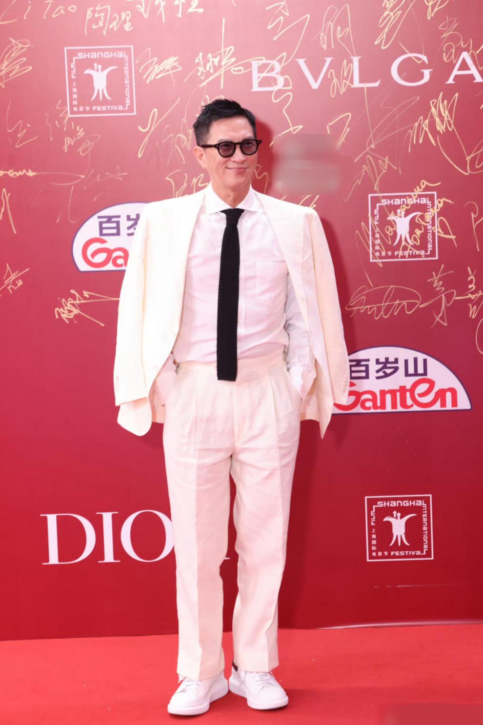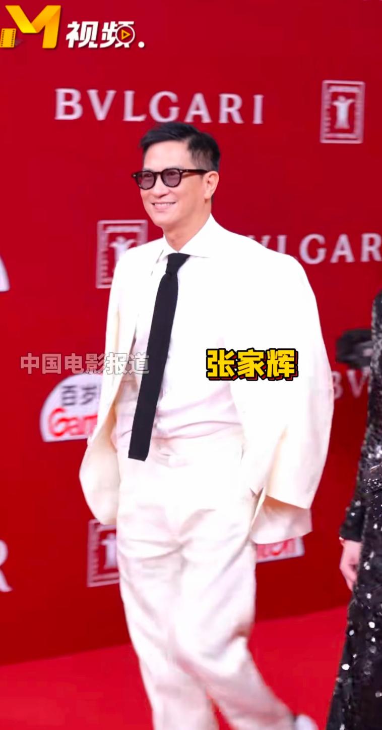 雖然是常見的白色西裝,但張家輝選擇當披肩來穿,就顯得與衆不同了,很有派頭和風範。