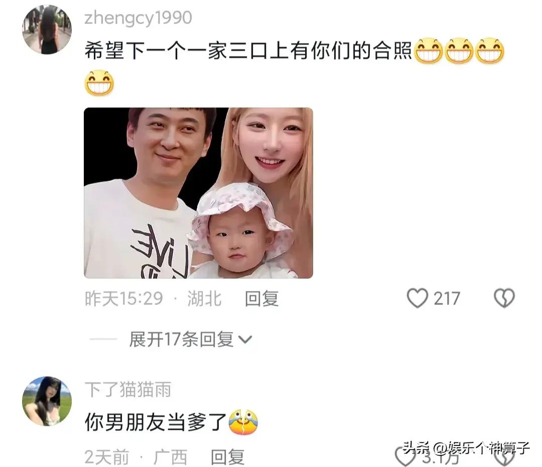“永遠不要懷疑WSC的眼光,你男朋友當爹了,思聰沒有空窗期,排了四年才排到,不過,有點晚了,還是學學黃一鳴吧,缺什麼趕緊提,過了新鮮期就沒用了”!